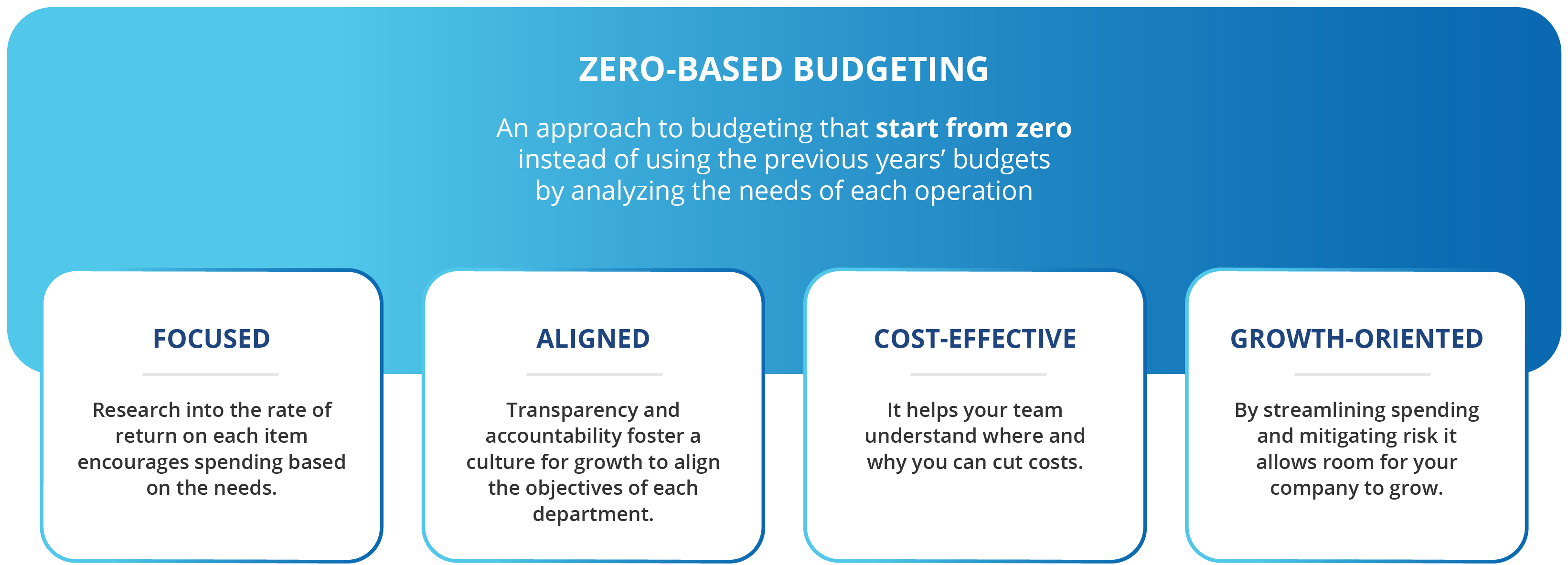 Zero Based Budgeting (ZBB) is an approach used to budget operational spending. It enables organizations to identify their major recent costs, and more importantly, determine the resources they need to allocate, align and sustain their strategic priorities.